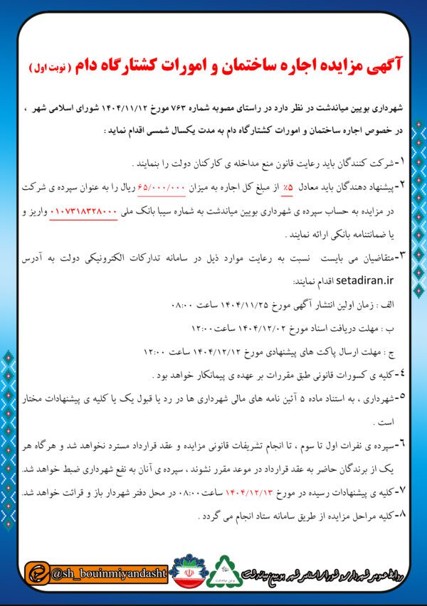 5. آگهی مزایده اجاره ساختمان و امورات کشتارگاه دام ( نوبت اول )